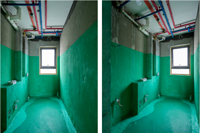 墻面涂料高度做到1.8m以上,頂面采用防水吊頂,比如石膏板吊頂或者鋁扣板集成吊頂?shù)龋?b>吊頂和柜子之間留有30mm的縫隙,以防后期萬一漏水,柜子不會全部廢掉。