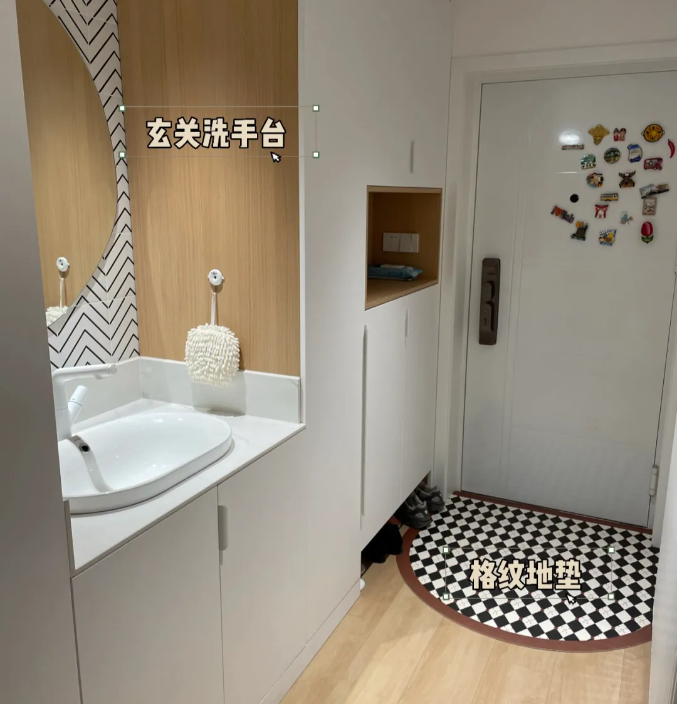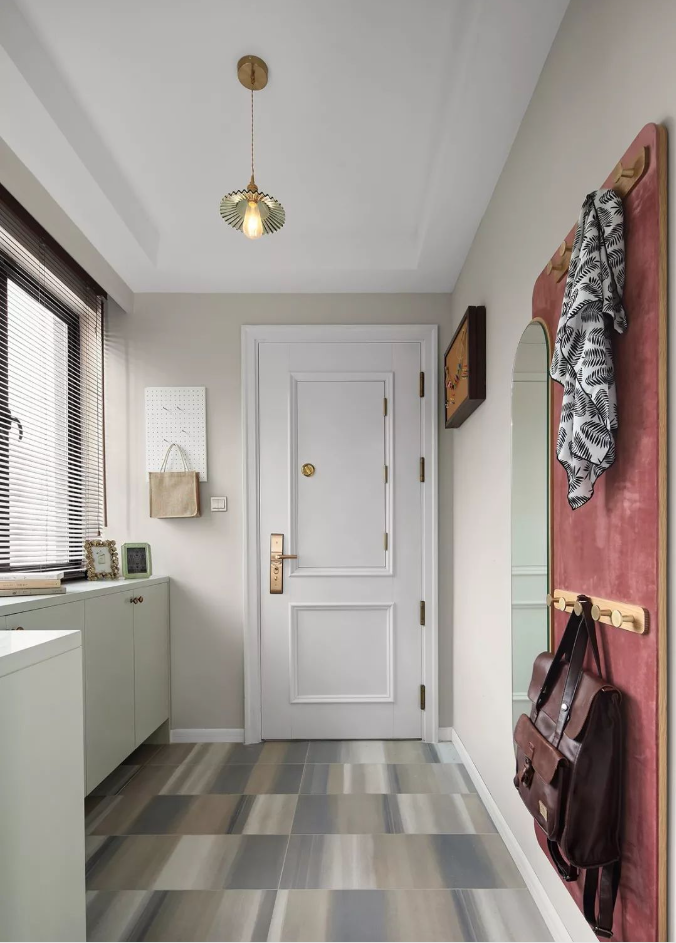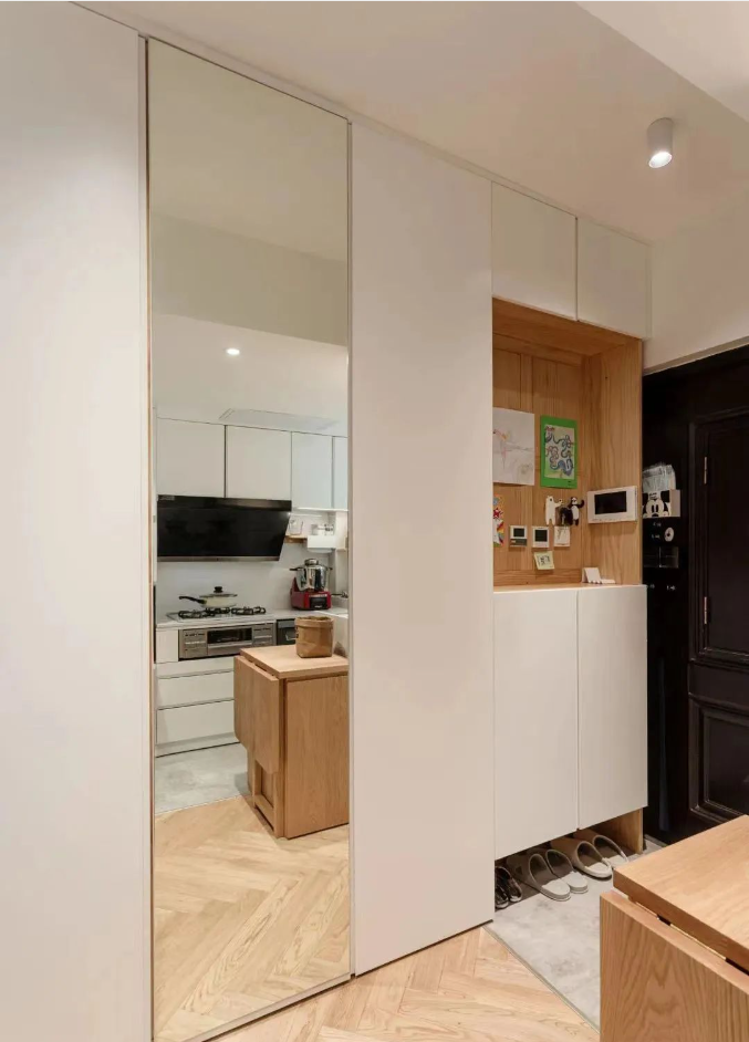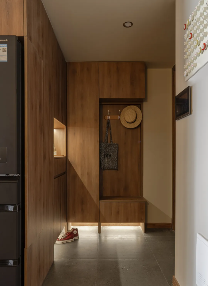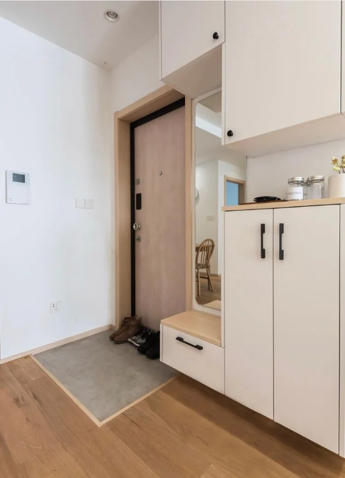 2、一體化玄關(guān)設(shè)計(jì):結(jié)合鞋柜、穿衣鏡、換鞋凳和洗手臺,這樣的設(shè)計(jì)既節(jié)省空間,又功能豐富。