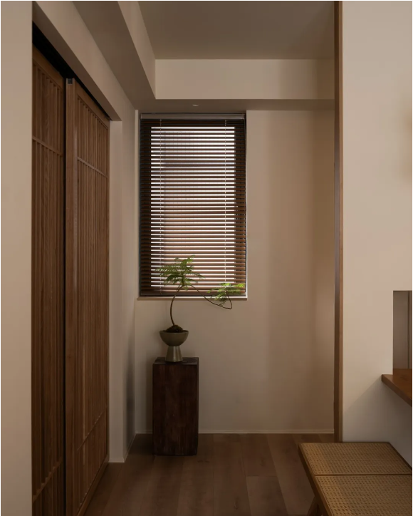 玄關(guān)左側(cè)以植物端景為列,右側(cè)上下定制透氣性更強的懸浮吊柜,用以日常鞋履的儲放。