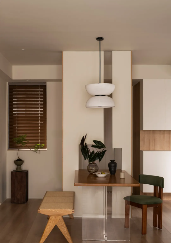 入戶以回歸自然為主旨,將傳統(tǒng)的可觀游園林設(shè)計手法帶入,餐桌的正中位置為點,新建墻體,將玄關(guān)獨立。