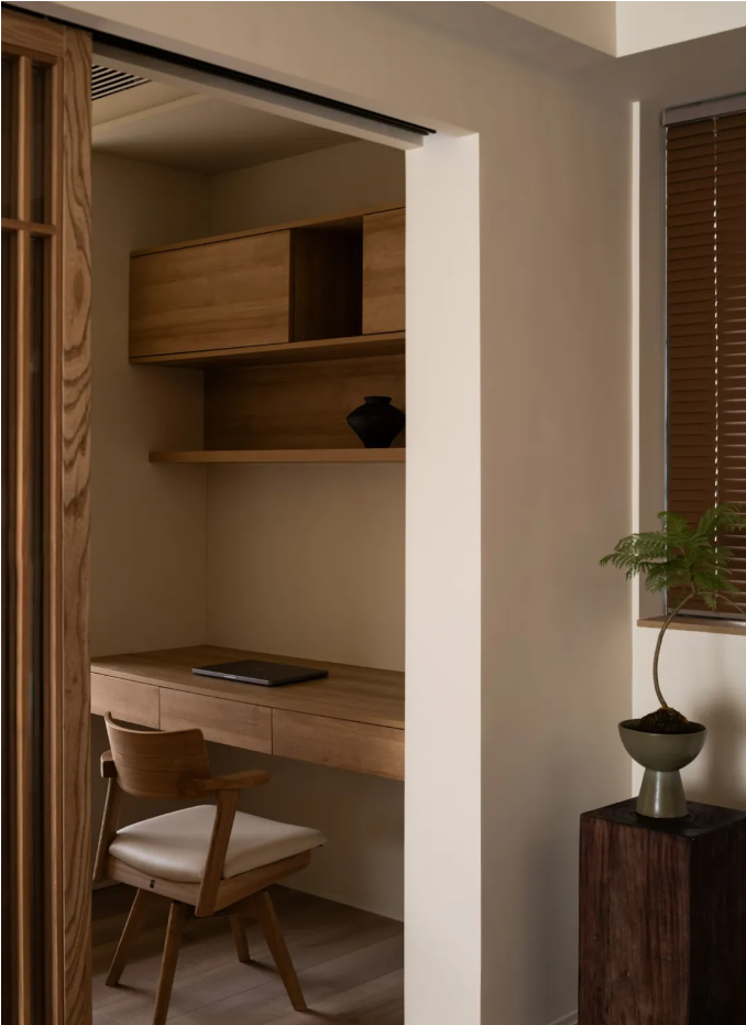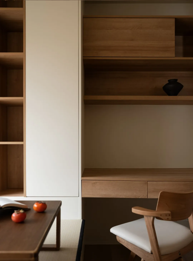 一間臥室,改變動線后,設(shè)計為集辦公、儲物、閱讀、茶室、臨時客房一體的多功能空間。