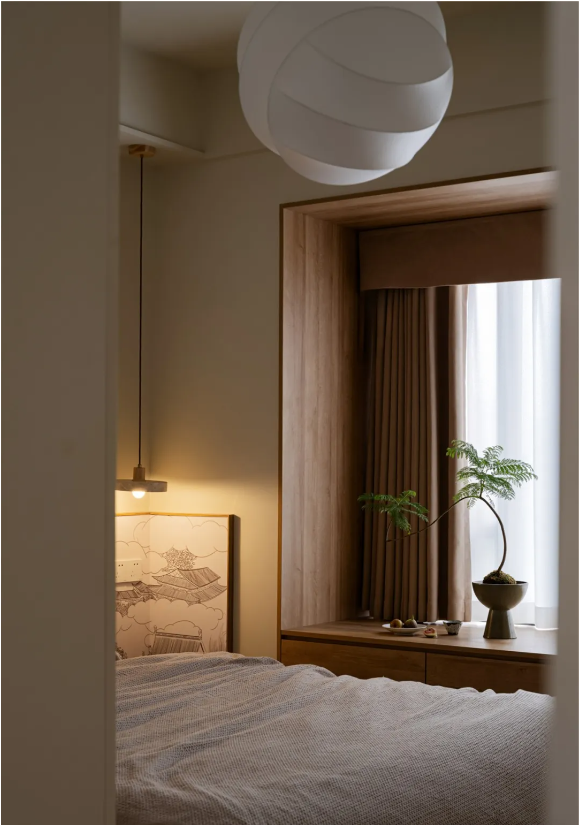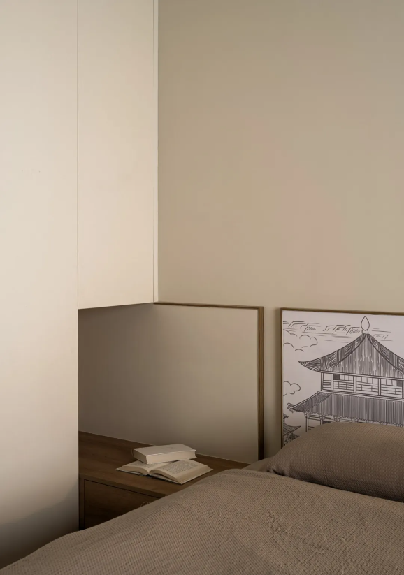 臥室延續(xù)外部素雅色調(diào),局部融入飽含東方美學(xué)意境的墻頭插畫,給予足夠優(yōu)雅、舒適的睡眠氛圍。